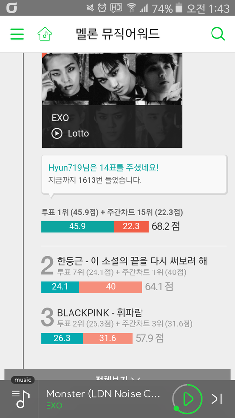 1둉군 저사람 투표 7위 했는데 음원 점수봐 이대로 가면 인기상도 뺏김;;
