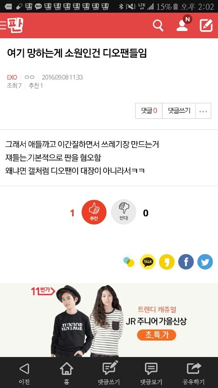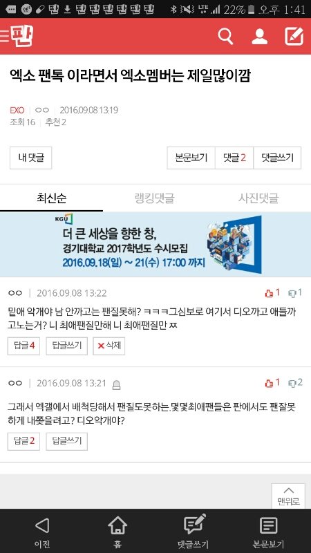 판대장짓한다는건 반박못할 사실이라는거지 그리고 쟤는 남연갤 여시 더쿠 판을하는악질이란거고 그게 누군진모르겠지만 쟤가맨날 엑갤엑소갤그러면서 얘기하더만