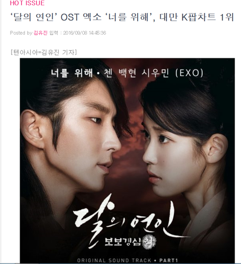 8일 ‘달의 연인’ OST 제작사에 따르면 지난달 25일 공개된 ‘달의 연인’ OST Part.1 엑소 ‘너를 위해’는 대만 최대 음원 사이트인 KKBOX K팝 차트에서 1위에 등극했다.