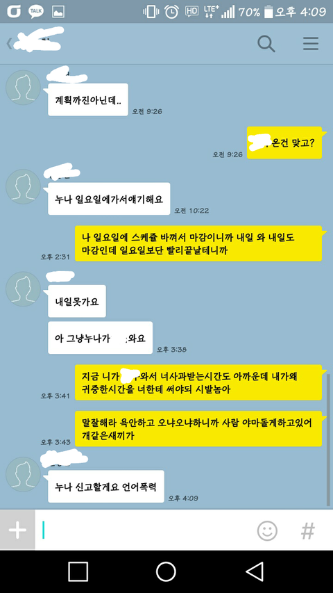 오늘 아침에 또 카톡했는데 태도바뀌는게 소름돋네요ㅋㅋㅋㅋ그냥 신고하기로 했습니다.