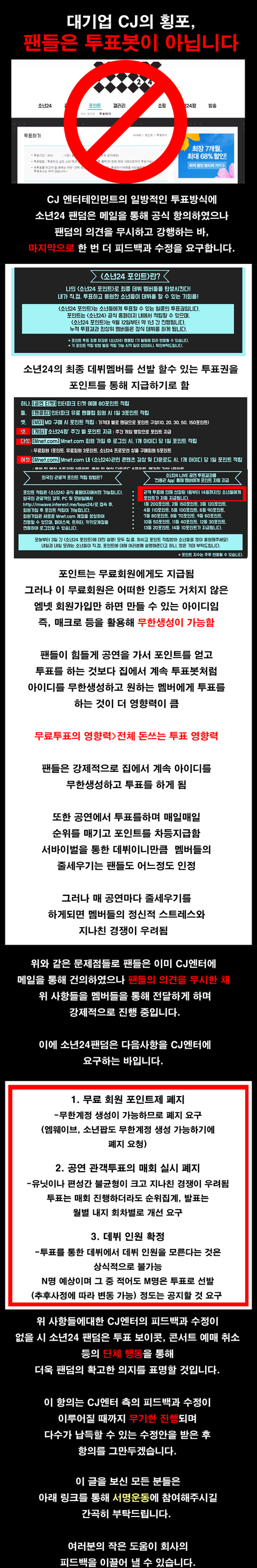 미친거 아니냐. 연습생이라고 함부로 대하는거 아니다. 어느집 귀한 자식들이다. 게다가 팬은 아이디 무한생성해서 일년내내 투표나 하란 얘긴데 이게 상식적으로 말이 되냐.