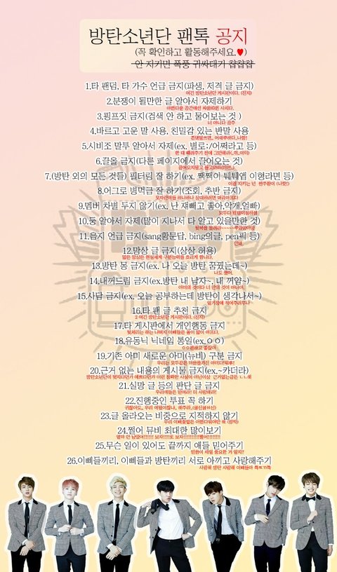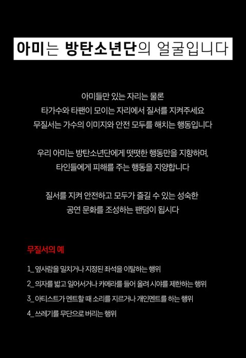 힘찬1함성 뿐만이 아니라 이제부터 연말 가요제, 창원 케이1팝 원아시아 등등 타 팬 분들 볼 일 많아지는데 질서 잘 지키자 항상 우리가 방탄의 얼굴이라는 거 기억하고