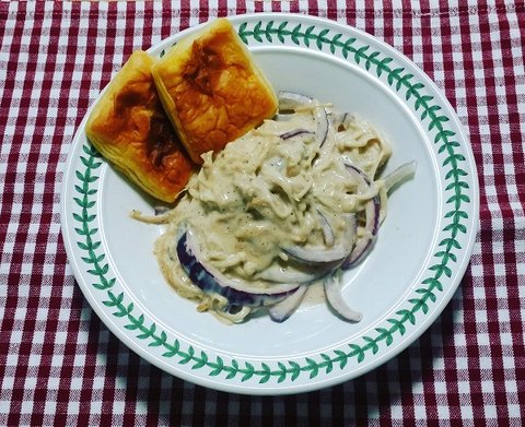 크림파스타하고 남은 소스로 팽이버섯이랑 양파넣고 빵위에 올려서 완성 !