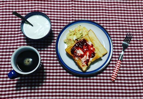 토스트 굽고 크림치즈랑 자두쨈 바르고, 감자랑 계란 당근 햄 양파 썰어 넣고 만든 샐러드