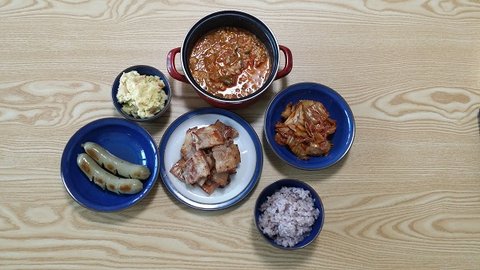 재료란 재료는 다 꺼내서 차렸더니 삼겹살 + 소세지 + 순두부찌개 + 볶은김치 + 감자샐러드