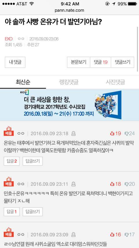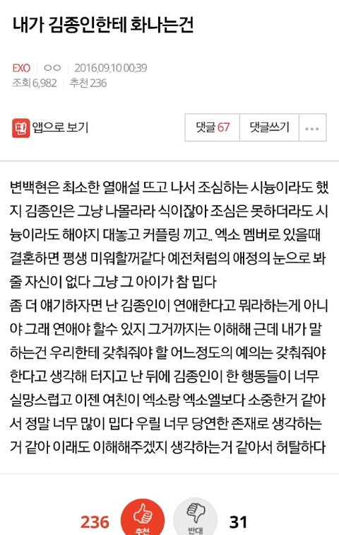 엑소엘이아니라 일부 백현팬들 생각입니다 이글보면 알겠지만 같은 공개열애라도 백현은 좋게포장하고 카이만 천하의 나쁜놈만드는글에도 추천 200넘게 찍은게 못된 백현팬들이에요
