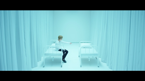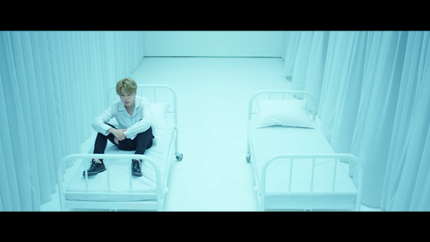지민이 영상에서 병원 침대로 보이는 침대 두개가 나란히 있고 그 중 하나에 지민이가 웅크리고 앉아있잖아