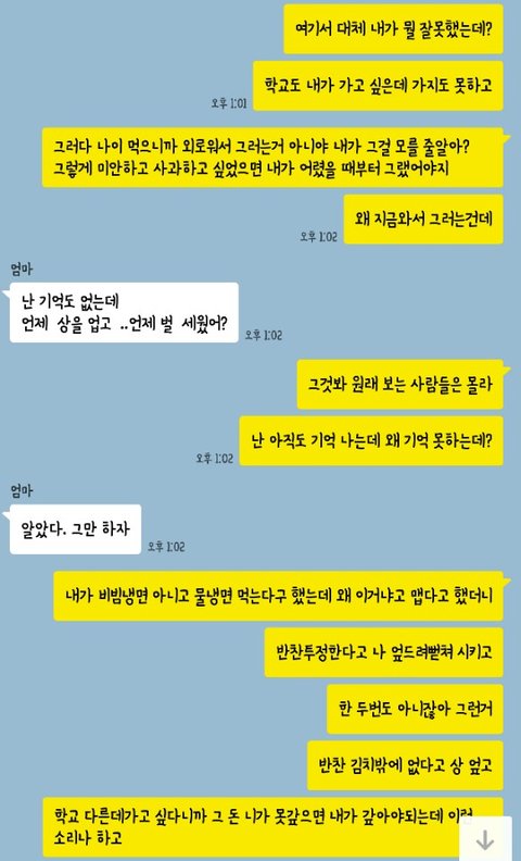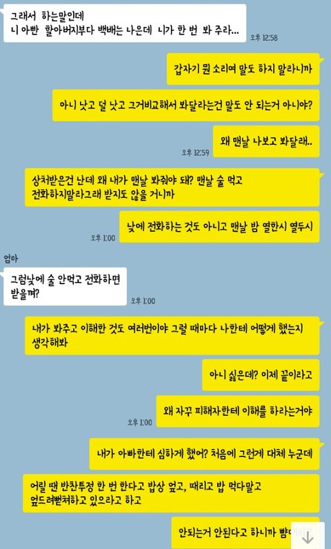 6. 아버지와 사이가 단절되니 어머니가 힘들어 했습니다. 더 길어질까 위에 적지 못한 과거들 때문에 너무 힘들었는데... 어머니가 힘들어 하니, 밖에서 살면서 조금씩 연락을 하며 억지로 마음의 문을 열었습니다. 그러다 4학년 2학기 때쯤 관계가 조금 풀려 어머니 10만원, 아버지 10만원 해서 20만원 정도 용돈을 받게 되었습니다. 억지로 아버지에게 사랑한다 하고, 억지로 보고 싶다 했습니다. 어머니가 사이가 안 좋은 부녀 때문에 힘들어 하니까. 저는 하나도 용서가 되지 않고, 그 상처가 아직도 생생한데. 학교 다닐 때 너무 괴로워 우울증 치료를 받으며 다녔는데. 저는 맏딸이니까. 참아야지. 하면서 억지로 감정을 만들었습니다.