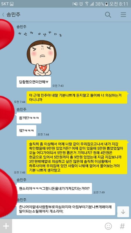 우선 난 일을가고 B랑 (B는 다른 대학교) C는 학교를 갔음 이년은 어느정도 상황파악이 됬는지 학교도 안나왔다고함 난 일이 빨리 끝나기만을 기다리면서 어떻게 해야될지 계속 생각하느라 일이 손에 안잡혔음 그렇게 퇴근을 하고 우리 셋은 서로 할일 다 끝내고 저녁 8시 좀 넘어서 만남 이년을 어떻게 족칠지 얘기 하면서 이년 집으로 향했음 이년이 가족이랑 같이 살아서 실례가 될거 같았지만 내눈깔이 뒤집힌 상태라 그런게 전혀 보일리 없었음 근데 내가 이년 집에 가본게 고등학교때가 마지막이라 어딘지는 알아도 정확히 몇호인지 가물가물했는데 C는 같은 학교라서 최근 일주일전에도 가서 잘안다고 몇호인지 알려줬음 이년 아파트앞에 도착했을때 우리 셋이서 얘기를 했는데 나는 당한게 있어서 간다고 치지만 B랑 C는 명확한 이유가 없는 상태라서 데려가기도 애매한 상황이였음 이년 혼자 살면 몰라도 가족이랑 같이 살기 때문에 우리 셋이 쪼르르 들어가기도 애매해서 서로 고민하다가 내린 결론은 나 혼자 이년 집에 찾아가고 B랑 C는 아파트앞 정자에서 기다리기로하고 나 혼자 이년 집앞에 도착해서 초인종을 눌렀음 근데 인기척도 없고 아무도 안나오는거임 그래서 한번 더 누르니까 "누구세요?" 하는거임 근데 목소리가 남자 목소리였음 듣는 순간 이년 오빠구나 싶었음 이년한텐 4살위 오빠가 있음 고등학교 3학년때 몇번 본적있어서 이년 오빠도 내가 누군지 앎 그래서 내가 "안녕하세요 저 ㅇㅇ친구 ㅇㅇ에요 할말있어서 왔어요." 라고 말하니까 "지금 ㅇㅇ 없는데" 라고 말하는데 지금 아니면 이년을 마주칠일이 없을것만 같은거임 그래서 "그럼 혹시 ㅇㅇ 올때까지 안에서 기다려도 될까요? 실례인거 아는데 좀 급해서요." 라고 말하니까 열어줌 오빠도 뭔가 있구나 싶었나봄 하여튼 그렇게해서 이년 집에 들어감 근데 이년 오빠가 좀 많이 무서움 부모님께서는 오냐오냐 키운 자식이지만 오빠는 조금의 잘못이라도 그냥 넘어가질 않는 스타일이고 고등학교 3학년때 이년이 학교에서 수업 한시간이라도 빠지면 부모님은 좀 나무라시는게 끝이지만 오빠가 가만두질 않아서 이년이 항상 입에 달고 사는 소리가 오빠 무섭다는 말이었기 때문에 가까이 지낸 사람들은 거의 다 앎 그래서 뭔가 나까지 경직되서 조용히 이년 방에 앉아서 기다리고 있었음 근데 오빠가 나한테 나와보라고해서 나갔더니 이년이랑 뭔일있냐고 묻는데 쉽게 말할수가 없는거임 .. 우선 아무리 이년이 잘못했다해도 가족이고 댓글에 달린거처럼 심증은 있지만 물증이 없는 상태라서 잘못 말하면 미친년 되는건 시간 문제잖슴 그래도 난 돈을 받아야 되는 입장이고 내가 당한 입장이기 때문에 조심스럽게 말함 대충 간추려서 이년이랑 만나서 놀다가 우리집에서 자고 가면 안되냐길래 우리집에서 재웠는데 내가 최근에 우리집에 들인 사람이 이년밖에 없는데 자고 일어나보니까 이년은 없고 지갑에 9만원 있었는데 6만원이 없어졌다고 그후에 연락했더니 이래이래 하더라 하면서 톡내용을 보여주고 근데 의심하고 싶진 않은데 누가봐도 이상황에서 의심 되는 사람은 이년인데 연락 안받길래 답답해서 왔다 이런식으로 말했음 솔직히 오빠 입장으로썬 자기 동생이니까 나한테 증거있냐는둥 이런식으로 뻔한 말들 내뱉을줄 알았는데 내 예상 밖으로 이년 오빠 표정이 조카 굳더니 바로 이년한테 전화해서 지금 당장 집으로 들어오라고 지금 안들어오면 너 절대 못들어올 각오하라고 장난 아니니까 생각 잘하라고 정확히 이렇게 말하고 끊음 순간 좀 멋있었음 ㅋㅋ 하여튼 전화 끊고선 나한테 우선 이년 들어오면 얘기 들어보자고 말하길래 알겠다고하고 이년이 오기만을 기다렸음 그렇게 15분쯤 지났을까 이년이 도착함 역시 오빠 말은 철썩같이 잘들음 ㅋㅋ 솔직히 안올리가 없잖슴 지 오빠를 그렇게 무서워하는데 하여튼 들어오자마자 오빠랑 내가 앉아있는걸 보고 표정이 진짜 오빠보다 더 굳음 ㅋㅋㅋㅋㅋㅋㅋ 난 이미 이때부터 개통쾌했음 설마 지 오빠랑 내가 같이 있을꺼라고 생각 했겠음 ? 하여튼 이년 들어오니까 오빠가 이년보고 앉으라하고 이년은 계속 눈만 내리깔고있고 이년 오빠는 계속 표정 굳어있고 난 예상치도 못한 상황에서 이러지도 저러지도 못하고 있었음 지금 생각해도 상황이 참 .. 대화가 많이 오고가서 지금부터 간략하게 간추려서 쓰겠음! 우선 오빠가 먼저 입을열음 나한테 다 들었다고 사실이냐고 니가 돈가져갔냐고 이년한테 물어봄 이년은 무서웠는지 계속 발뺌함 증거있냐면서 자긴 진짜 아니라고 믿어달라고함 믿어달라는말만 수없이한듯 ㅋㅋ 그걸 보는 나는 어이가 없고 진짜 황당해서 직구로 날림 소액이라도 아무리 작은 돈이라도 신고되고 나 혼자 사는게 위험하기도하고 무서워서 혹시 몰라서 노트북 캠 항상 켜놓는데 난 니얘기 먼저 들을라고 아직 확인도 안했다고 솔직히 말하라고 내가 오늘 집가서 확인했는데 찍혀있으면 그거 들고 바로 경찰서 갈꺼라고 이년을 떠봄 ㅋㅋ 이렇게 말하니까 이년도 오빠도 진짜 표정 심각했음 그래서 내가 이래도 솔직히 말안할꺼야 ? 너 자신 있는거지 1