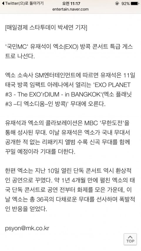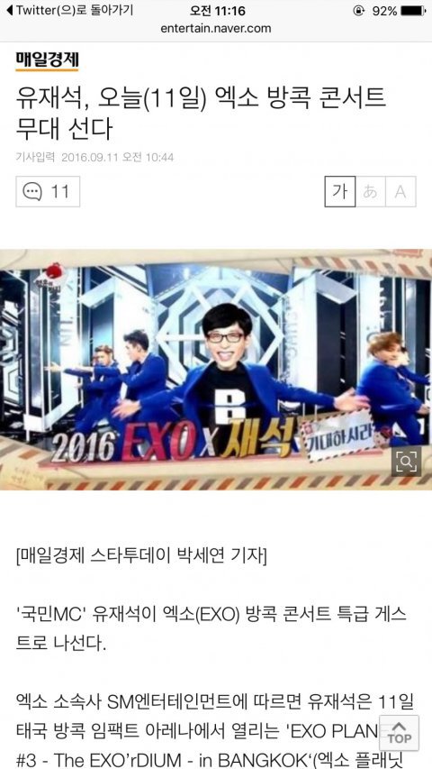 유재석, 오늘(11일) 엑소 방콕 콘서트 무대 선다