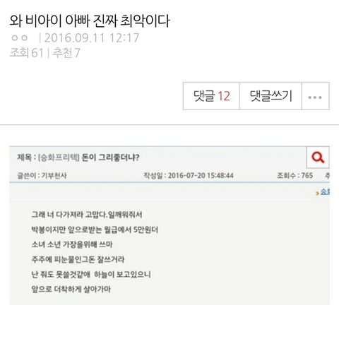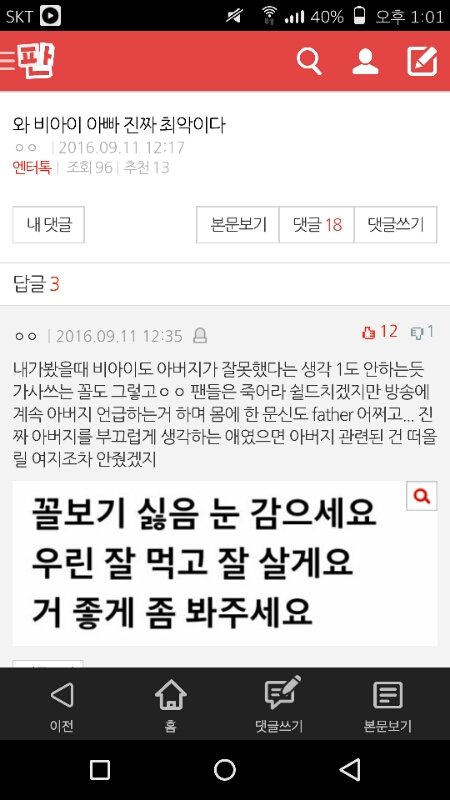 간만에 조용했는데 어휴 그리고 깔꺼면 비아이 아버지만 까라 제발 비아이 왜 욕먹이는거야 심지어 베댓 추천수 조작까지 하더라ㅋㅋㅋ 그리고 다시한번느낀게 코닉진짜 없다는거 혹시 몰라서 캡했는데 추천조작맞는듯 댓글도 혼자쓰고있음