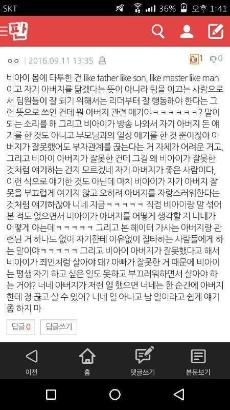 우선 난 아이코닉임. 사실 해명글 이라기도 뭐한 해명글이야. 그 톡선에 올라간 글은 1~2년 전에도 충분히 끌올되고, 논란이 됬었어. 그때마다 해명 쭉 했는데 사실 비아이가 잘못한게 아니라 해명하기도 뭐 하다. 어쨋든 코닉들도 비아이 아버지가 진짜 잘못한거 알고, 정말 안타깝거든.. 이제 해명 시작할께