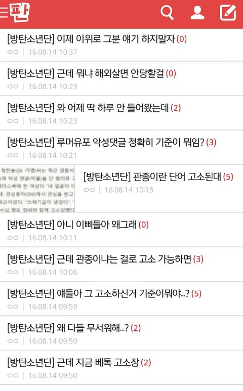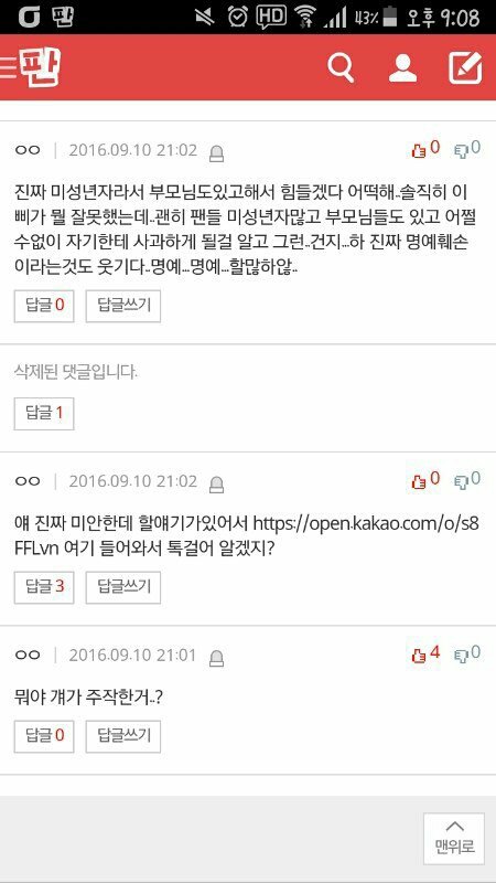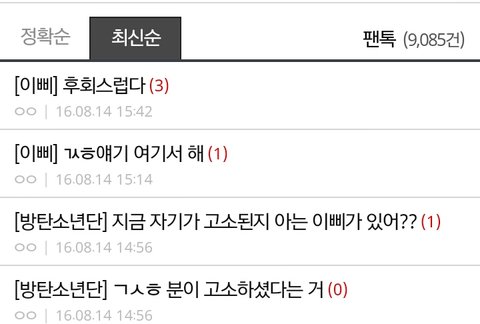 저거 저 일반인을 욕한 사람을 고소한 게 아니라 저 일반인이 주작하던 상황을 정리 해 준 글을 쓴 사람을 고소한 거임 한 마디로 쟤는 욕 먹어서 고소하는 게 아니라 그냥 주작하다가 찔려서 고소하겠다는 거고 뭘 좀 알고 얘기해 비방 하나도 없었고 온전히 정리하는 글 뿐이었어 욕 하나도 없었다고 제발 뭘 좀 알고 욕을 해 지긋지긋한 새끼들아 하루도 가만히 놔 두지를 않냐 제발 좀 냅둬라 우리 팬톡 관음 좀 그만하고 제발