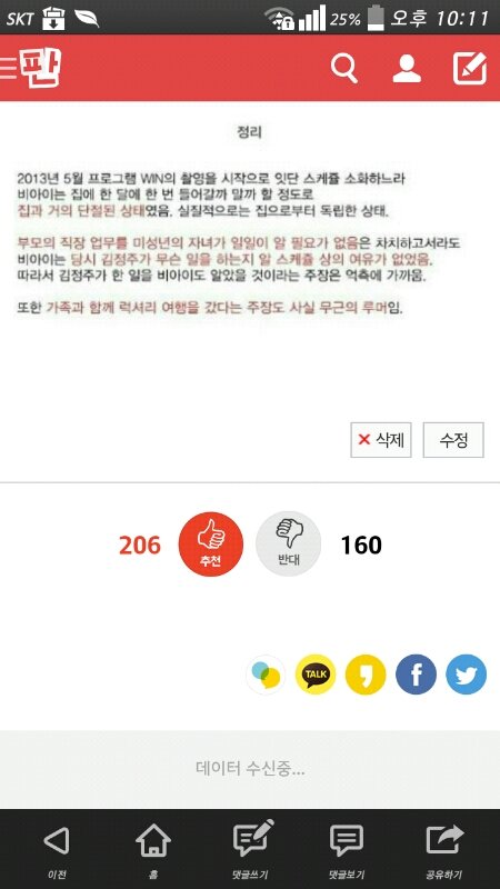 사람들 오해 풀어주려고 해명글 올렸는데 댓글은 악플이 많아서 너무 속상하다.. 그냥 아이콘이라서 미치게 까는거 같아.. 예전에 준회랑 진환이 클럽 그거 때도 판 탈퇴 하려다가 해명 때매 안했는데 그때도 찜닭집이라고 해명글 어떤 코닉이 올렸는데 귀 막고 오해한 채로 잊혀져갔잖아.. 그래서 또 똑같이 될까 판 탈퇴 하고 글삭 하고 싶은데 오해는 풀고 싶고 한빈이 사진만 보면 눈물 나오고 슬프다 진짜.. 글삭 하고 판 탈퇴 할까 아니면 지푸라기라도 잡는 심정으로 한빈이 보면서 해명할까..