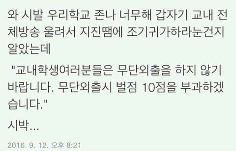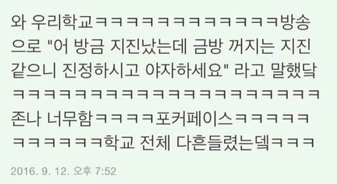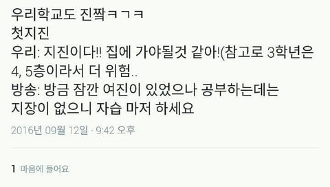 우리는 야자하고 있는데 갑자기 학교 흔들리더니 복도에서 한남자선생님이 다나가!!!하고 엄청크게 소리지름 평소에도 개념있는 발언으로호감이엇는데 더호감됨