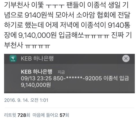 이종석이 팬들 기부하는거 서치해서 그 계좌로