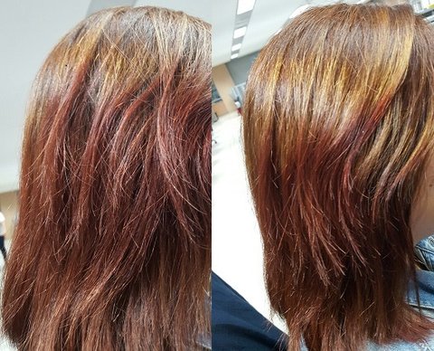 검은색 염색이 남아 있는 부위는 탈색 진행을 해야 한다고 해서 두시간 넘게 탈색 하였고 탈색한 부위에 테스트를 하니 검은색 염색약이 잘빠지지 않아 붉은색이 남는다고 했습니다. 그래서 중간에 카키 브라운은 포기하고 붉은빛이 들어가는 브라운으로 염색하자고 상의하여 염색을 진행 하였습니다.
