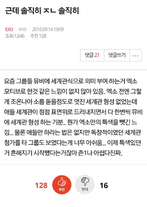 아이돌에 세계관을 부여해서 의미 넣는 거 스엠이 최초인 거 알고 있고 스엠만의 컨셉인 거 알고 있어 그런데 문제는 너희가 인피니트와 방탄소년단을 확실하게 저격하고 있다는 거야