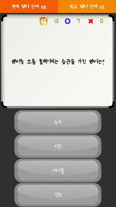 지금 심심해서 이거 하는데 모르겠으............막혔다....틀리면 첨부터 다시해야하는데....후하후하 짱싫 내가 방탄한테 너무 관심 없었나.....