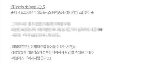 워메ㅠㅠㅠㅠㅠㅠ이번주 음중에서 스폐셜스테이지로 어제처럼굿나잇한대ㅠㅠㅠㅠㅠㅠ브이앱 스포이거였나봐ㅜㅠㅠㅠ드디어 완전체 어굿나를 볼수있다니ㅠㅠㅠㅠㅠㅠ
