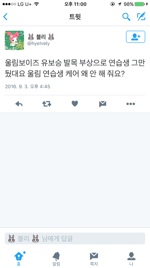 다리부상으로 나갔다든데 ㅠㅠㅠㅠㅠ빨리나아서 건강한모습으로돌아와서 울림에서 데뷔했으면좋겠다 널응원해!