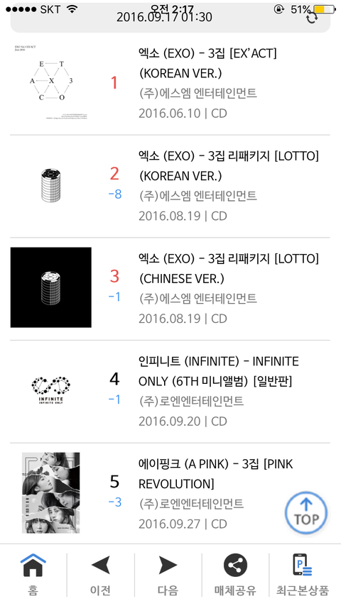 2위 였던게 아깐 아예 사라지더니 나타났는데 4ㅇ야...6월달에 나오신 ㅇㅅ 앨범이 순위권이고..