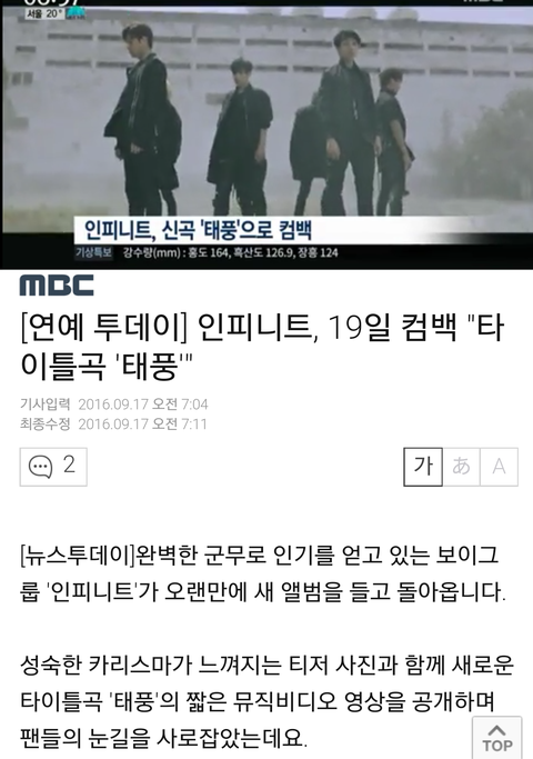 아침 엠1비1c뉴스 연예 소식란에 컴백뉴스 나왔어