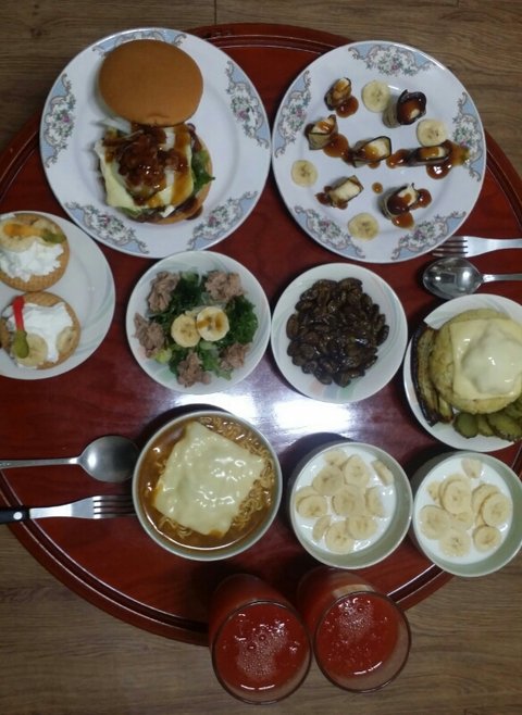 수제햄버거&바나나말이&계란참치치즈볶음밥&번데기&참지샐러드&치즈라면&바나나요플레&지렁이쿠키