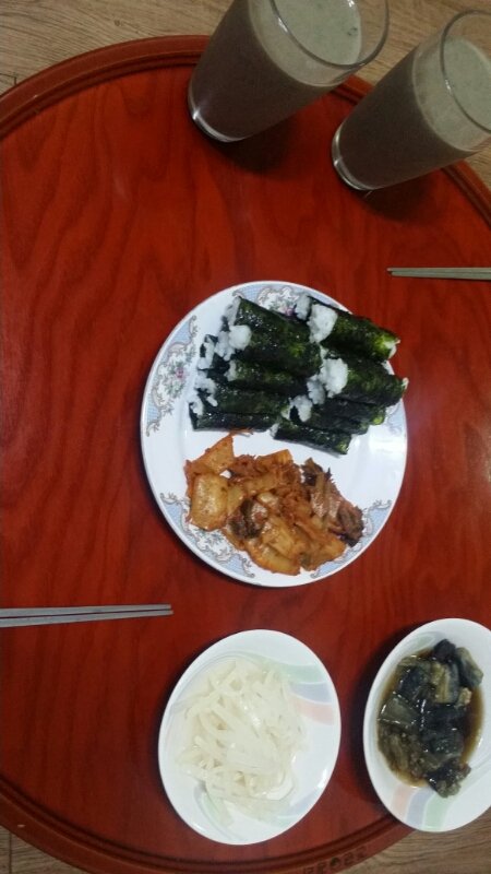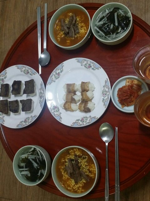 소고기라면&미역배냉국&김치&소고기초밥&돼지고기말이