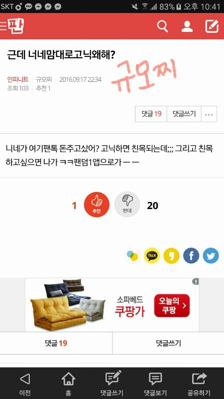 아까 규모찌로 닉도용당한 잉톡이야! 혹시라도 오해하지 않았으면 좋겠어서 이렇게 다시 올려! 그리고 고닉이더라도 도용당할 수 있다는 게 너무 당황스러웠엉.. 다들 조심해야 될 것 같아ㅠㅠ! 고닉도 바꿀 예정이야! 이렇게 글 계속 올려서 미안해 마무리를 어떻게 해야되지.. 앞으로 스밍 열심히 하자!!!!