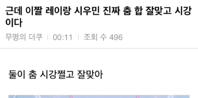 어제 시우민반응 터짐 누구조작해서 부풀려 톡선보내는 것과 달리 정직하게 시우민보고 팬들이나 타팬들이 달리던 찰나 레이,시우민 춤 좋다 라는 글 올라옴