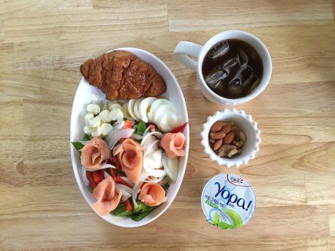 훈제연어샐러드 & 스트링치즈 & 미니크로와상 & 삶은 계란 입니다.