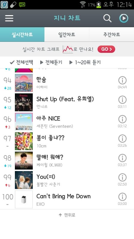 10시 차트 6단계 상승 100위 진입 11시 차트 1단계 상승 99위 12시 차트 3단계 상승 96위 뮤직중심 덕분인가 사람 많이 없는 시간에도 많이 오른다