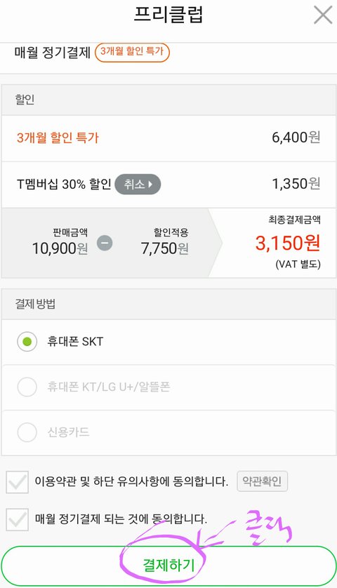 1. sk폰 이용자: 30퍼 할인돼서 3,465x3해서 3달에 10,398원이고 1년에 3달 할인받을수 있어. 본인멤버쉽아니어도 타인꺼 폰인증만 가능하면 사용할수 있어. 단점은 폰요금으로만 결제가 가능해. 부모님 걸려서 힘들면 친구들한테 대신 해달라하고 폰하나로 아디 3개까지 가능하니까 그리하면돼. 첫달 프로모션보다 이게 더 저렴해. 혹시 sk아닌 사람은 주변 sk이용자에 부탁해서 이용해도 되니까 참고하고~순서는 사진순으로 결제하면돼