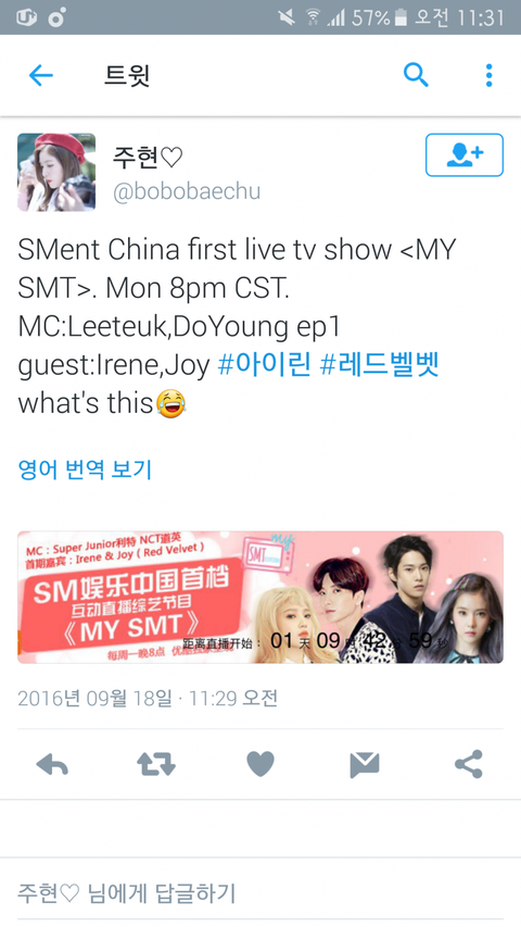 이 프로그램 내일한국시간9시 온라인생중계인데 원래조이였다 웬디로바뀜 이번주음악중심 아파서 사녹때 병원갔다오고 오늘도 팬싸때 불참했때 빨리나았으면 1위시켜주자 다음주에