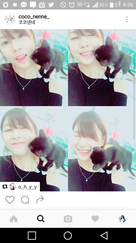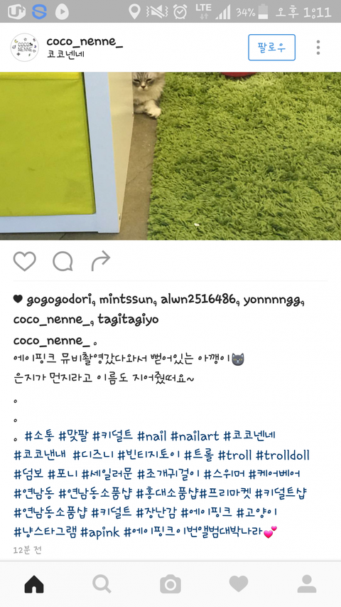 하빵이 인별에 고양이랑 같이 찍은 사진. 그 사진 속 고양이가 뮤비 찍은 고양이