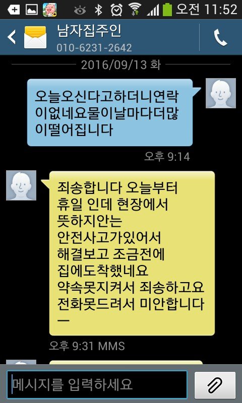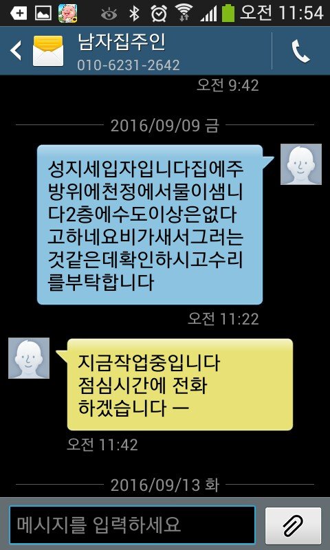그래서 울 마미 집에 물이 새서 한번 상태좀 봐줬으면 좋겠다고 몇주를 연락을했는데, 알겟다고만 하고 있다가 그렇게 명절이 다가왔어, 근데 물새는 집에서 어떻게 명절을 보내겟어. 그래서 그전에 와서 보고 처리좀 해달라고 부탁들 드렸어. 문자 사진 내가 첨부 할건데,