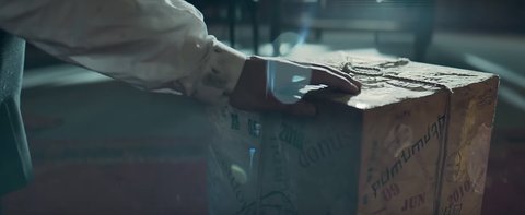 상자를 만지는 엘. 상자에 빼곡히 적혀있는 문자들, 날짜는 2016.09.19와 2010.06.09