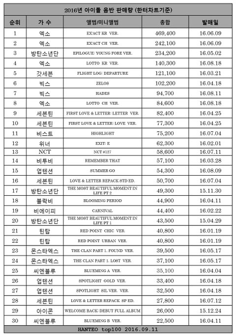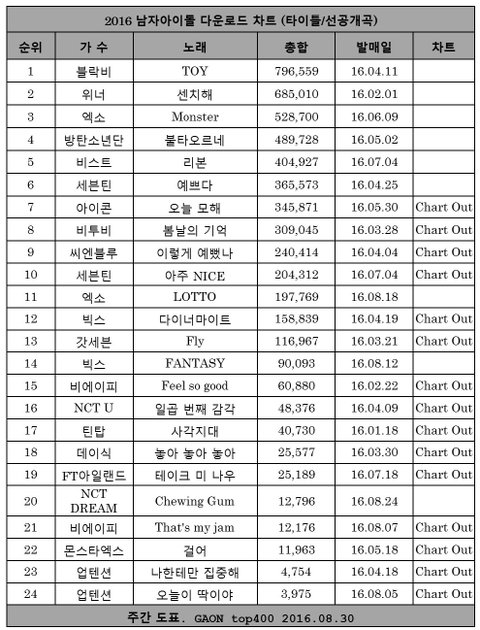 2016 남자아이돌 다운로드 차트 (가온 차 + 한터 차)