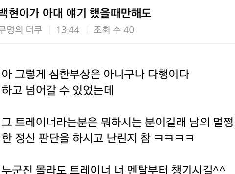 예능을 예능으로 안본년들이네 백현이가 트레이너 험담하려고 저얘기 꺼낸게 아닐텐데;;;수호최애들 뭔가 오바하는느낌이야