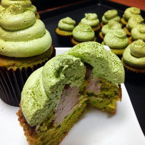 잘구워진 컵케이크에 녹차치즈크림과 단팥크림채워 완성!