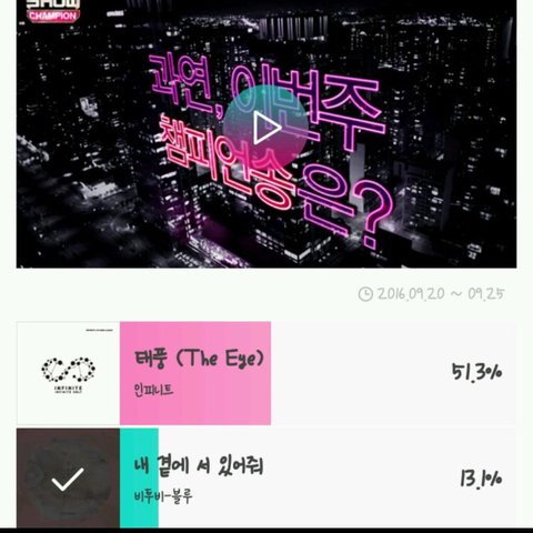 내일 쇼챔피언 ㅇㅍㄴㅌ 분들도 출연안해서 투표율 조금만 높으면 1위할거같기도 한데 ㅠㅠ 투표 안한사람 아이돌챔프깔아서 투표하자 ! 한그룹에 3표씩 가능하니까 꼭하쟘 )-(