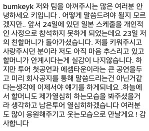 그리고 갑자기 일본 프로모션 스케줄에 건강상의 문제로 참여하지 못한다는 공지가 올라옴. 그러나 이후에 있던 다른 스케줄에는 정상적으로 참여해서, 팬들은 그 날 컨디션이 안 좋았다고만 생각했음. 그런데 인스타에 이런 글이 올라옴.