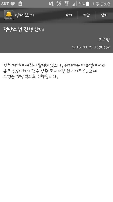 이렇게 불안한데도 불구하고 학교에서는 규모 3.9이하는 무조건 정상수업을 한다는 입장이며