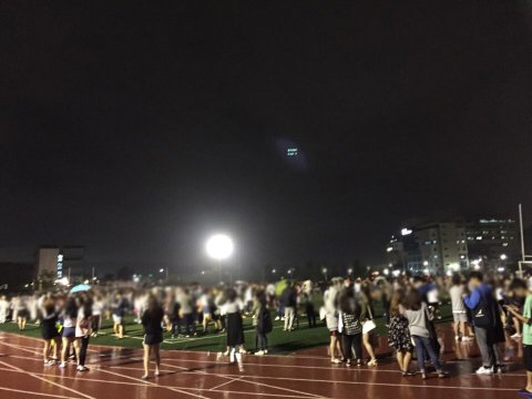 학생들이 운동장으로 뛰쳐나와 추위에도 불구하고 들어가지 못하는 모습입니다.