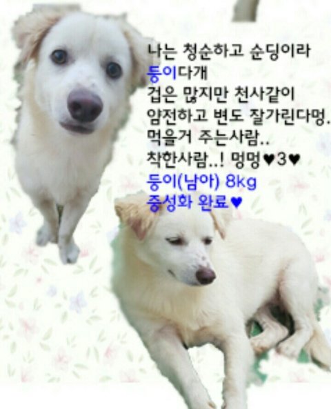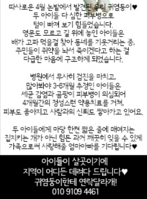 두녀석다 심한 피부병으로 털이 빠져 보기가 흉하며 먹을걸 찾아 동네를 기웃거린 아이들을 주민들이 쥐약을 놔서 죽이겠다고 하는걸 다급함 마음에 구조하게 되었습니다.