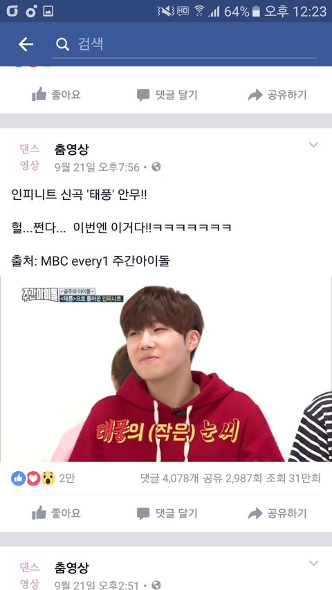내꺼하자 안무영상은 81만 이고, 태풍짧은안무는 31만, 걸그룹댄스는 40만정도야. 공유수도 장난아니고, 얼굴책 무개념도 많은데 댓도 다 긍정적. 입덕한다는글도 많고,.... 이걸 계기로 슬슬 역주행했으면...