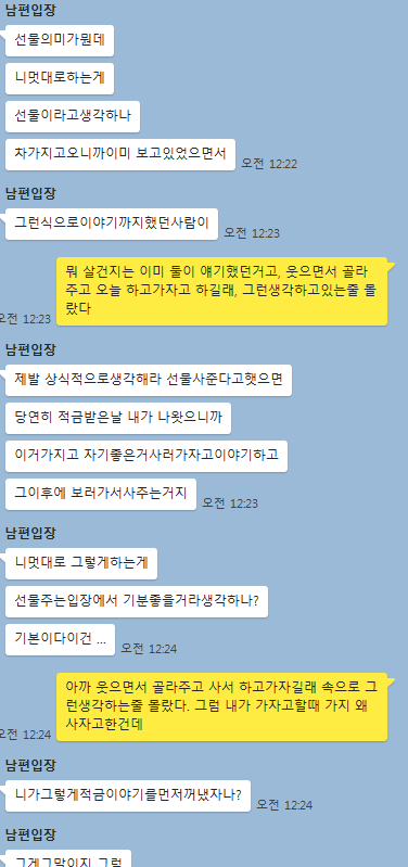 왜 사라고 부추겨놓고 이제와서 딴지를 거는지...그리고 자존심 여부를 떠나서 아내가 가자고 했을때 가면 되지 저런게 무슨 남자 자존심이라고 내세울 문제냐, 이렇게 맘에 두고 싸울바에는 저자리에서 그냥 안사고 나오는게 훨씬 나았겠다.