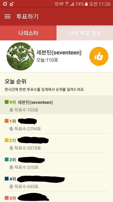 전엔 5위정도였는데 지금 9위야ㅠㅠ 하루에 10번 투표할수있어!! 접속만하면 무슨 상자줘서 5번넘게 할수있고!! 하루하루 누적되는거라서 역전할수도없을거야ㅠㅠㅠㅠ1위랑 투표수 차이 많이나ㅠㅠ