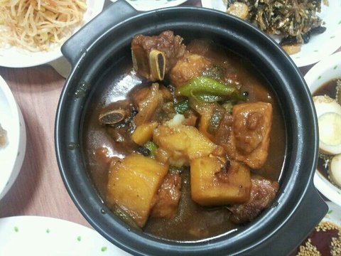 썬 야채위에 만두 올리고 소스 (소스는 고추장 +설탕+깨+식초=초고추장) 갈비찜~신랑이랑 저랑 소갈비보다는 돼지갈비를좋아해서 ㅋㅋ